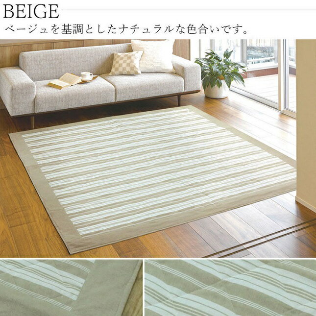 サイズ:約130×180cm カラー:ネイビー、ベージュ、グレー 組成:表地=綿100%【ナチゥラルコットン】、 中材=ポリエステル綿100%、裏地=ポリプロピレン100%【不織布】 原産国:インド製 ■ホットカーペット・床暖房に対応しています。